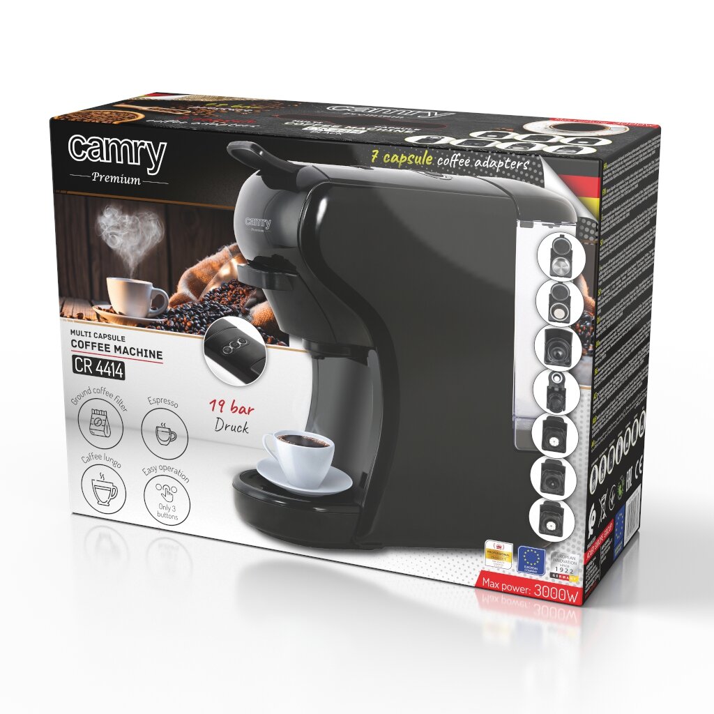 Еспресо машина за мляно кафе и капсули Camry CR 4414 ви позволява да приготвяте 9 различни вида кафе, задоволявайки и най-претенциозните вкусове. Функционалността на еспресо машина за мляно кафе и капсули 9в1 Camry CR 4414 се потвърждава и от факта, че е оборудвана с 5 адаптера за кафе. Благодарение на това вие няма да се ограничавате до кафе от една марка, а можете да приготвите любими напитки от Nespresso, Dolce Gusto, Lavazza Blue, Lavazza Modo Mio, Caffitali.