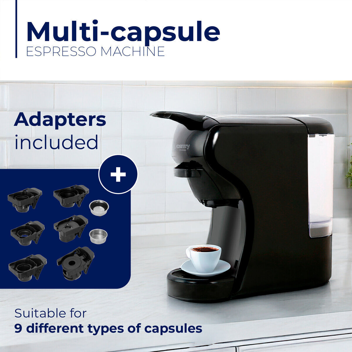 Кафемашината Camry CR 4414 е съвместима с 9 вида капсули, благодарение на 5 сменяеми адаптера, подходящи за различни марки кафета.