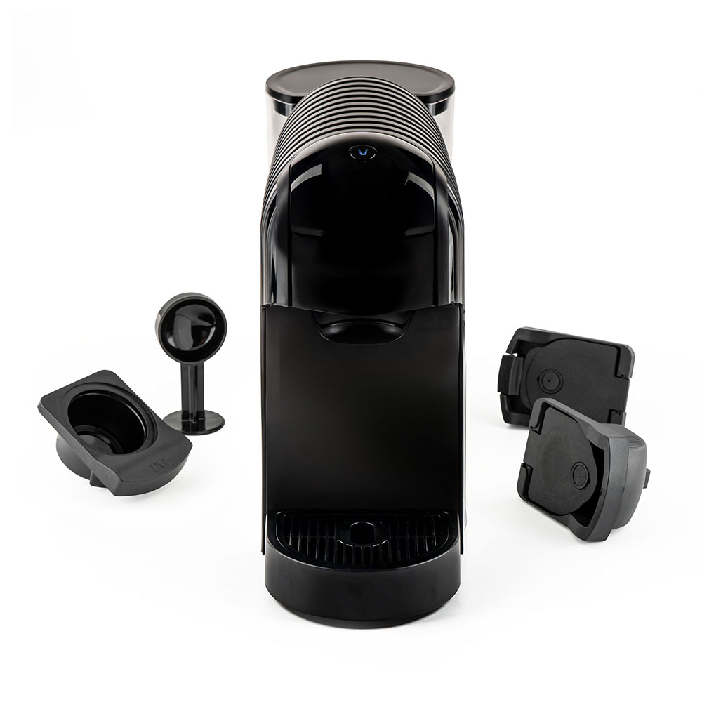 Дизайнът е стилен и компактен, изцяло в елегантен черен цвят, който се вписва перфектно в съвременната кухня. Резервоарът за вода е с вместимост 0.9 литра и е подвижен, което улеснява както пълненето, така и почистването. В комплекта са включени три адаптера за различни видове кафе, което осигурява още по-голяма гъвкавост.