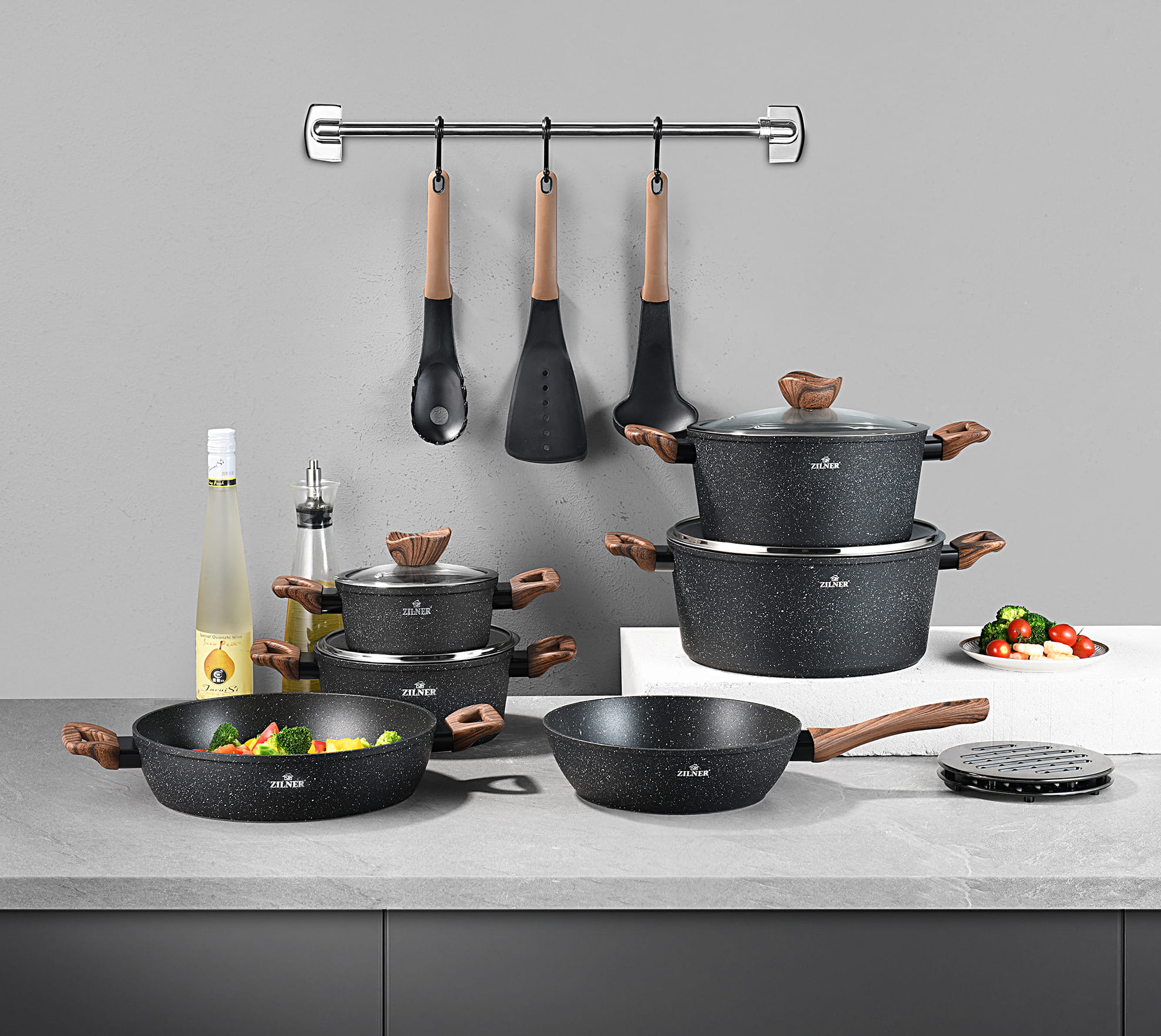 Готварски комплект от 15 части Zilner ZL-8518, Мраморно покритие, Лят алуминий, Индукция, Черен