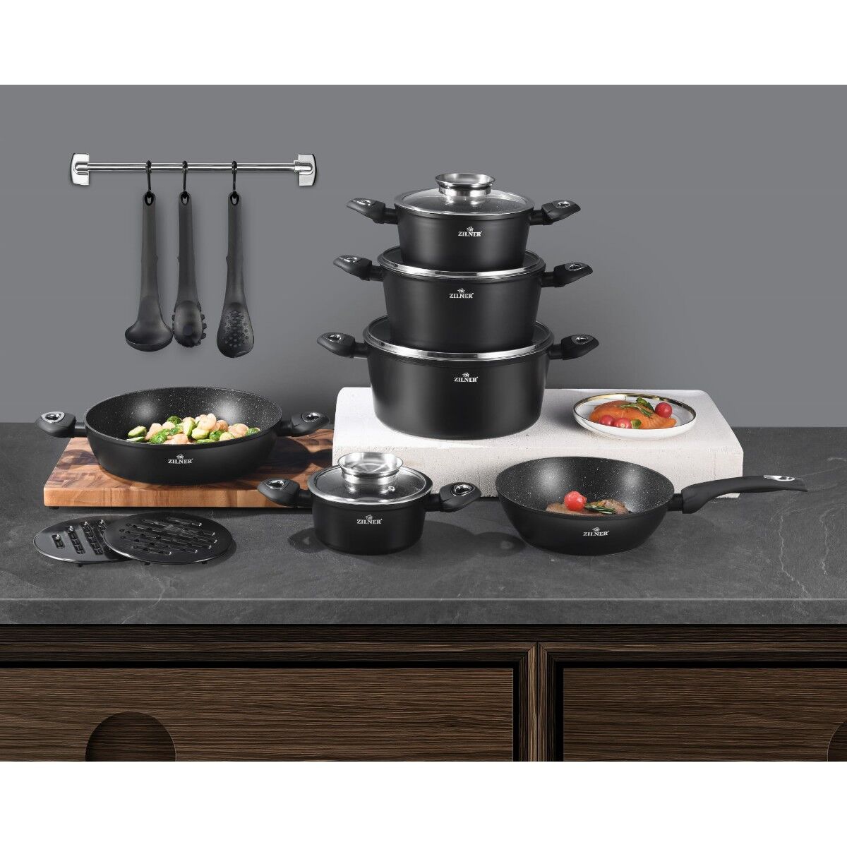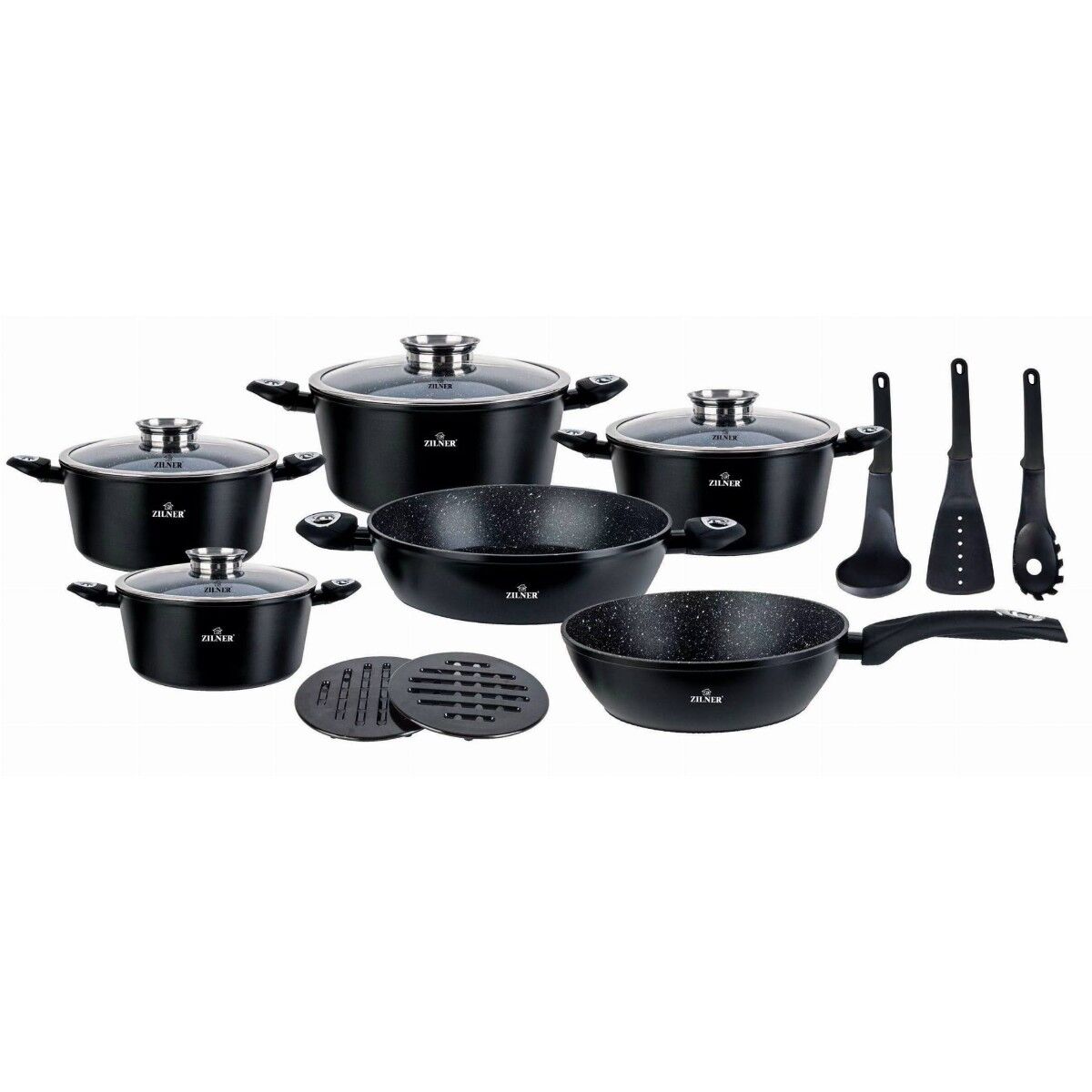 Готварски комплект от 15 части Zilner ZL-8570, Мраморно покритие, Лят алуминий, Индукция, Черен