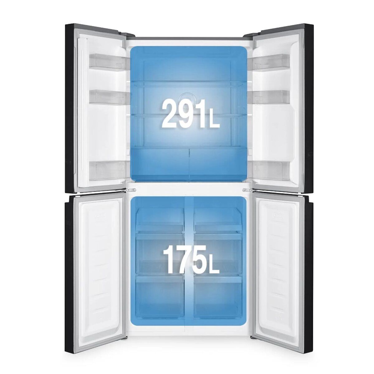 Хладилната част включва три стъклени полици, две чекмеджета и шест рафта на вратата — перфектна организация за напитки, пресни плодове, зеленчуци и млечни продукти. Фризерната зона разполага с четири чекмеджета и два рафта, които позволяват удобно подреждане на замразени храни.