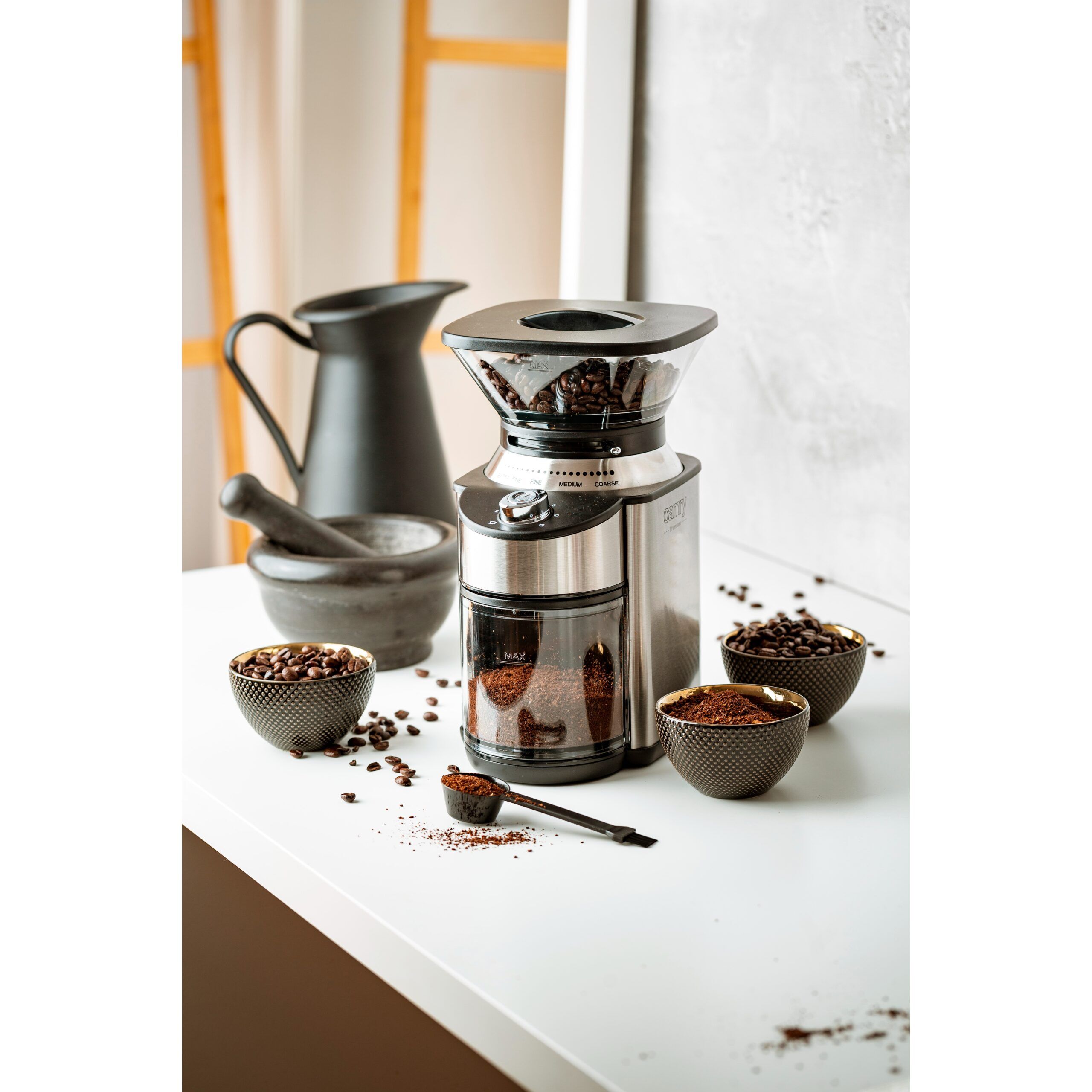 Почитателите на кафе като еспресо, капучино или лате също ще оценят настройката за смилане. Всеки има предпочитания за това какво кафе му е най-вкусно, нашата мелачка ви позволява да изберете една от 16-те настройки за смилане от изключително фино до грубо. Нещо повече, пълен контейнер гарантира приготвянето на 12 чаши кафе. Не е нужно да пускаме мелницата всеки път, когато искаме да се насладим на кафето. Автоматичното изключване и двойният предпазен ключ правят използването на тази мелница безопасно и интуитивно.