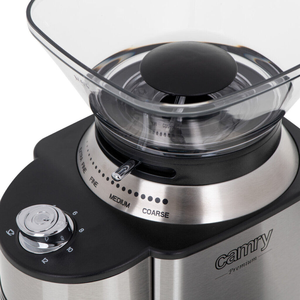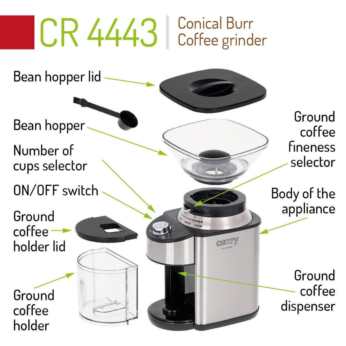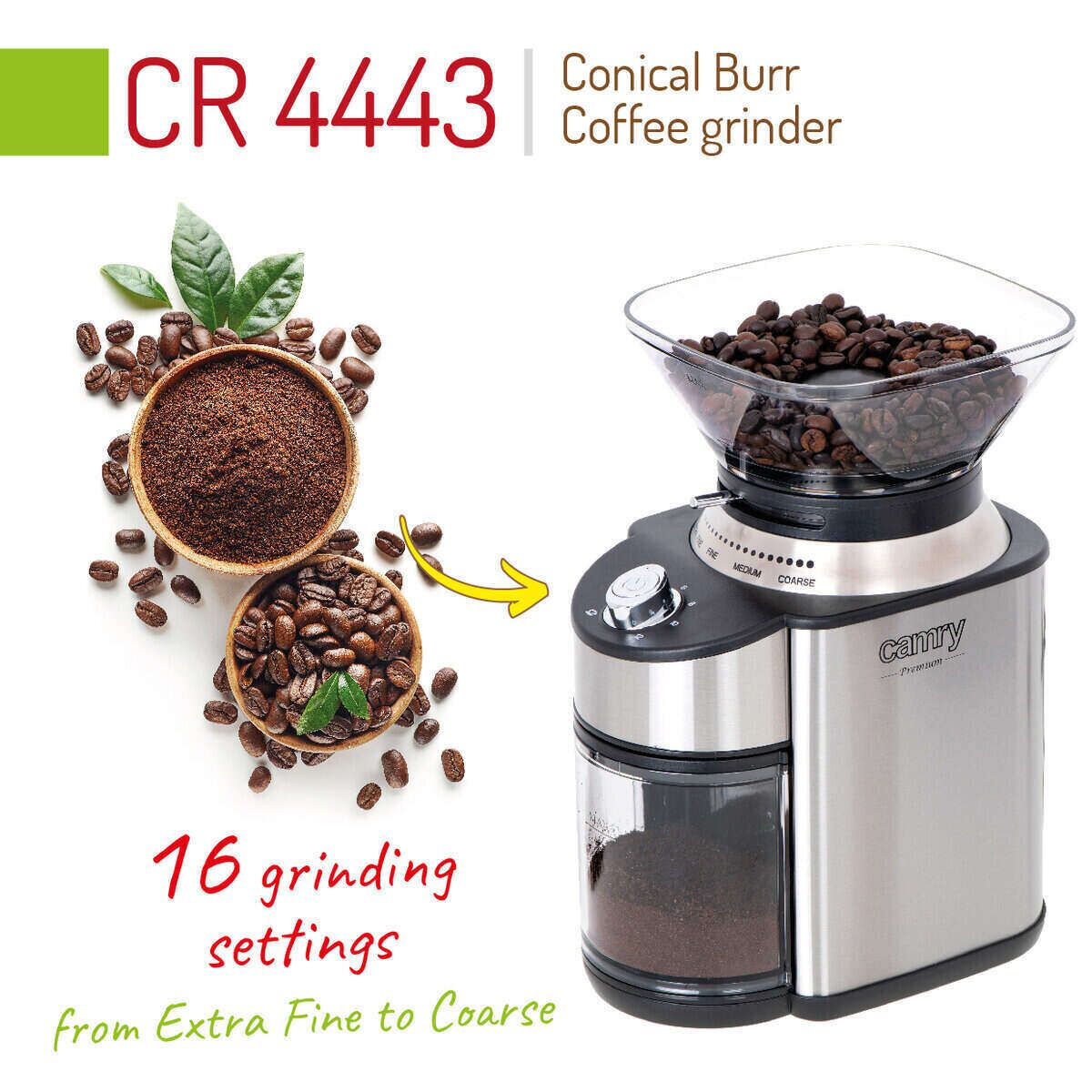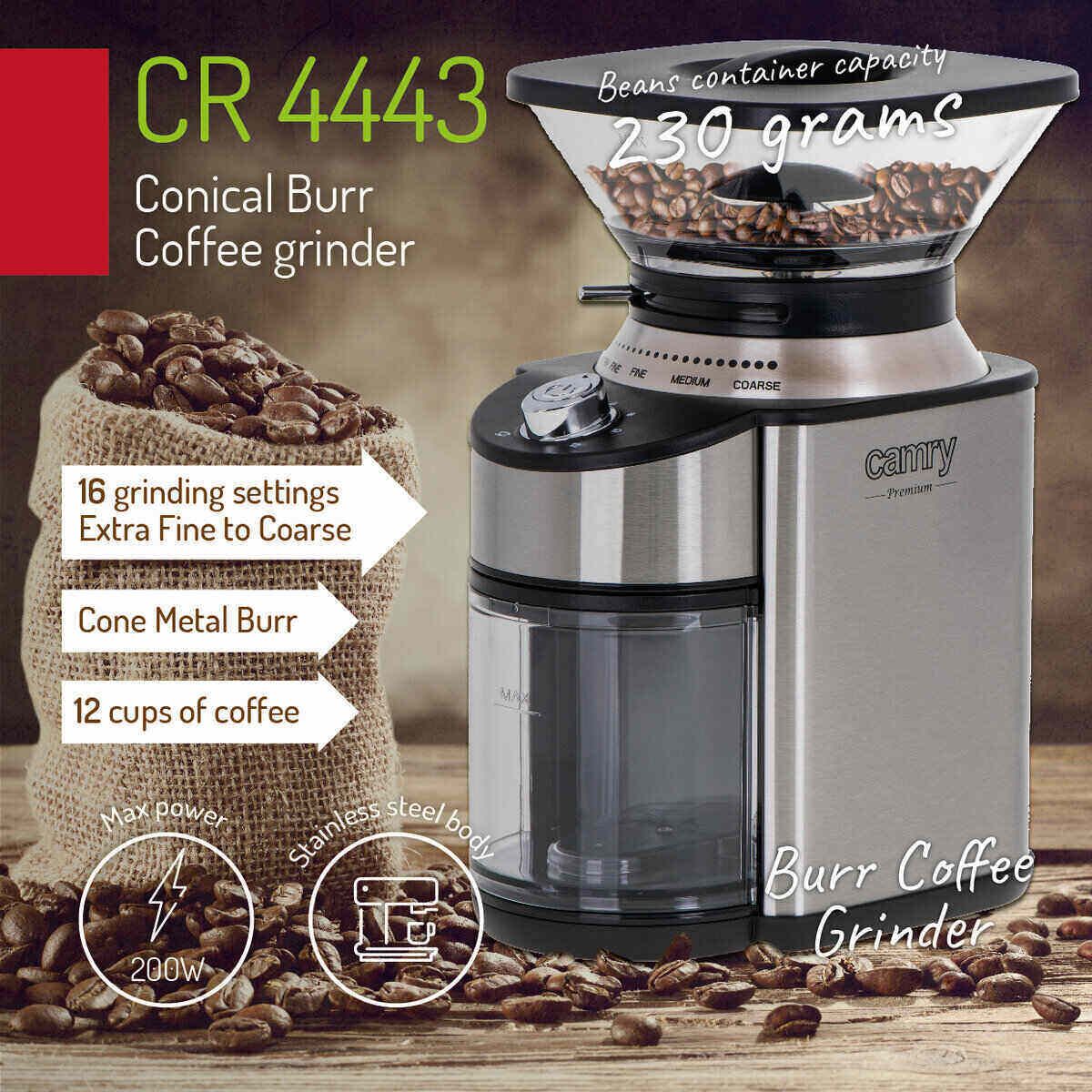 Кафемелачка Camry CR 4443 Burr, 200W, 16 настройки на смиляне, 230 гр, Черен/Инокс