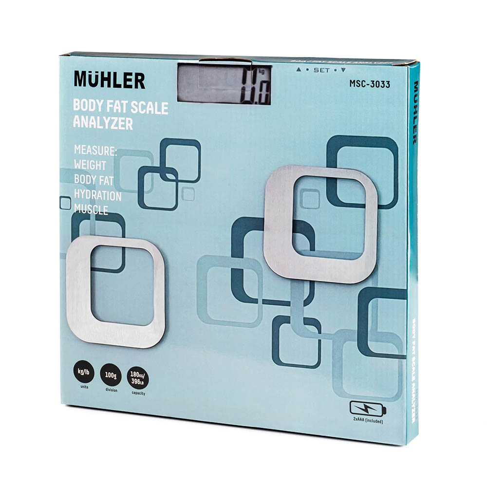 Muhler MSC-3033 предлага високотехнологичен анализ на телесния състав – не просто измерване на теглото. Кантарът предоставя информация за телесните мазнини, ниво на хидратация и тегло на костната маса, като по този начин осигурява по-пълна картина за вашето здравословно състояние.