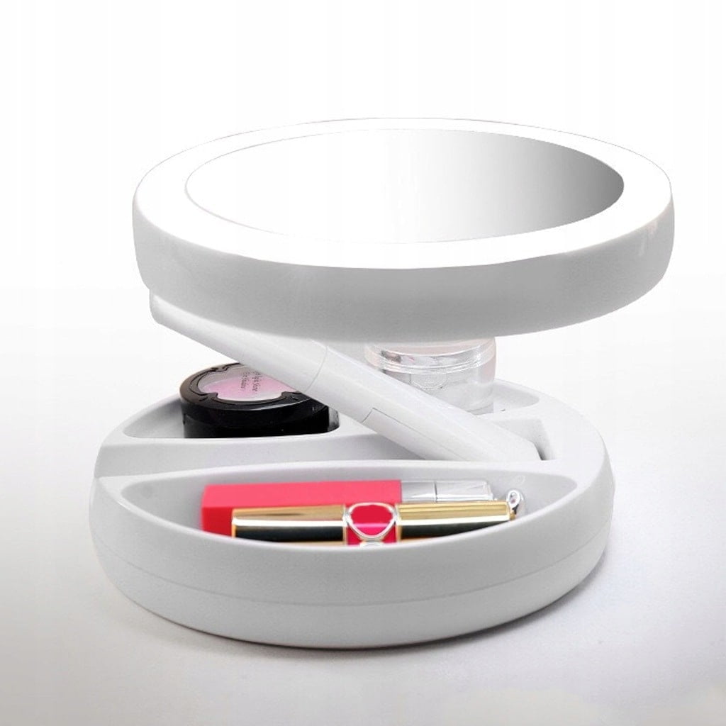 Подвижна мини гримьорна с компактно кръгло огледало за гримиране с LED светлина и стабилна сгъваема стойка. Настолното огледало за гримиране предлага улеснение за дамите при гримиране и пълна независимост от осветлението при подготовката им за вечерта.