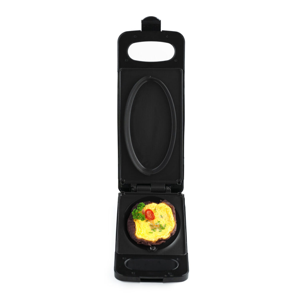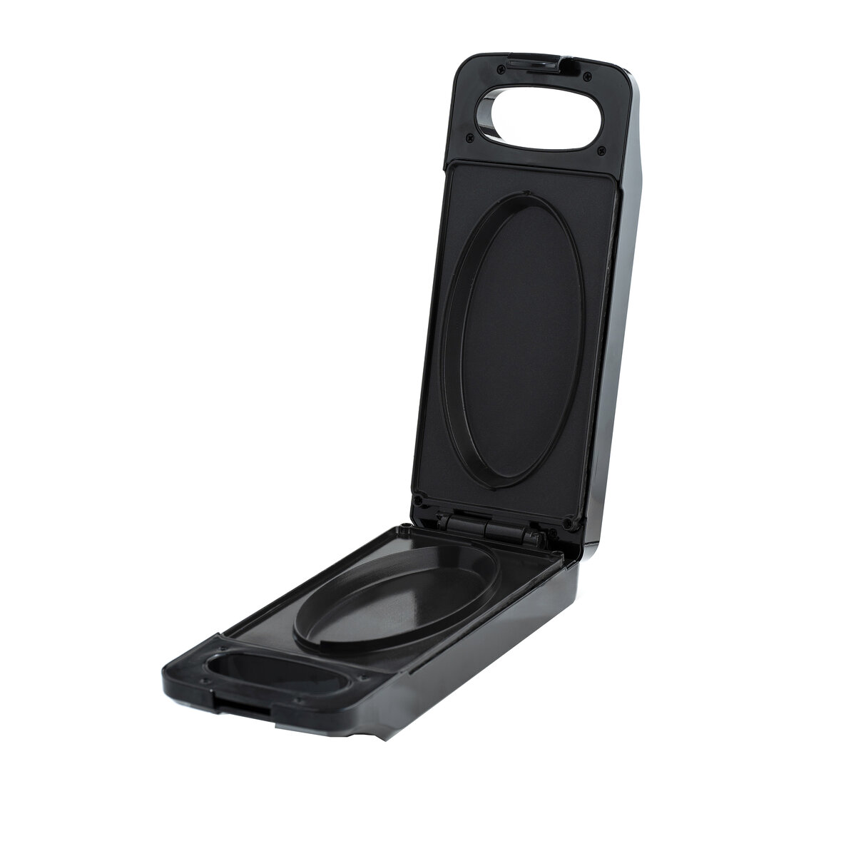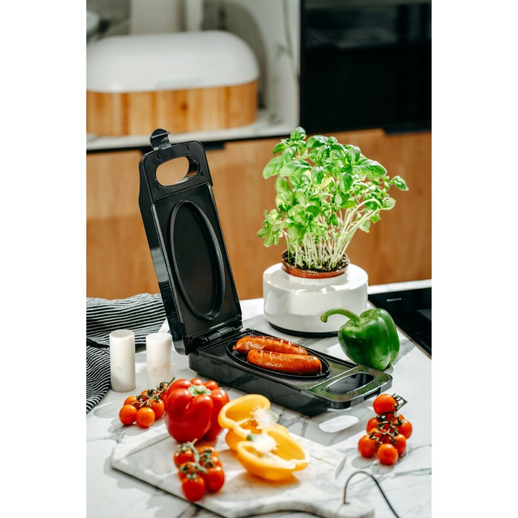 Незалепващото покритие на нагревателните плочи гарантира лесно почистване и предотвратява загарянето на храната. Уредът разполага със стабилни гумени крачета за безопасност и удобство по време на работа, а дръжката, която остава хладна, осигурява комфорт при употреба.