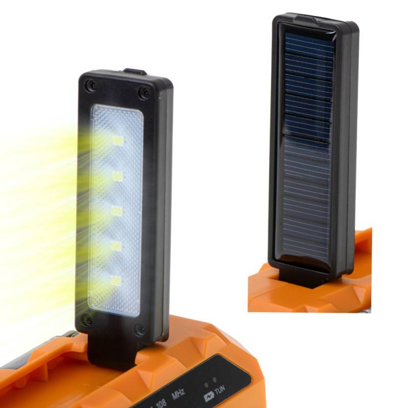 – Мултифункционално устройство, захранвано от собствена батерия, голям и ефективен соларен панел или зареждано от динамо