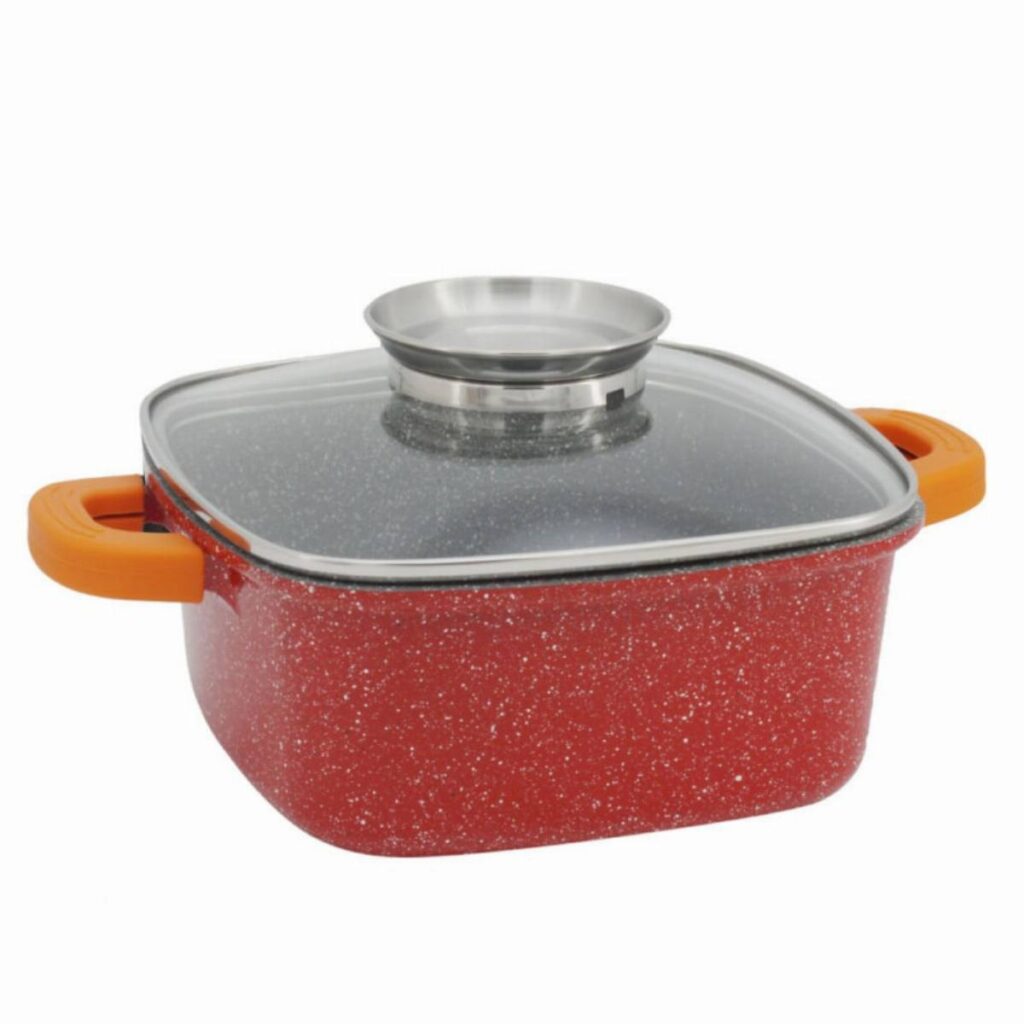 Тази квадратна тенджера от висококачествен лят алуминий с гранитно покритие е отличен избор за всеки, който цени здравословното и удобно готвене. Капакът със стъклен дозатор за мазнина и стабилната конструкция с лети дръжки осигуряват комфорт и безопасност при употреба. Подходяща за всички видове котлони, включително индукционни, тази тенджера запазва топлината за дълго и е изключително лесна за поддръжка.